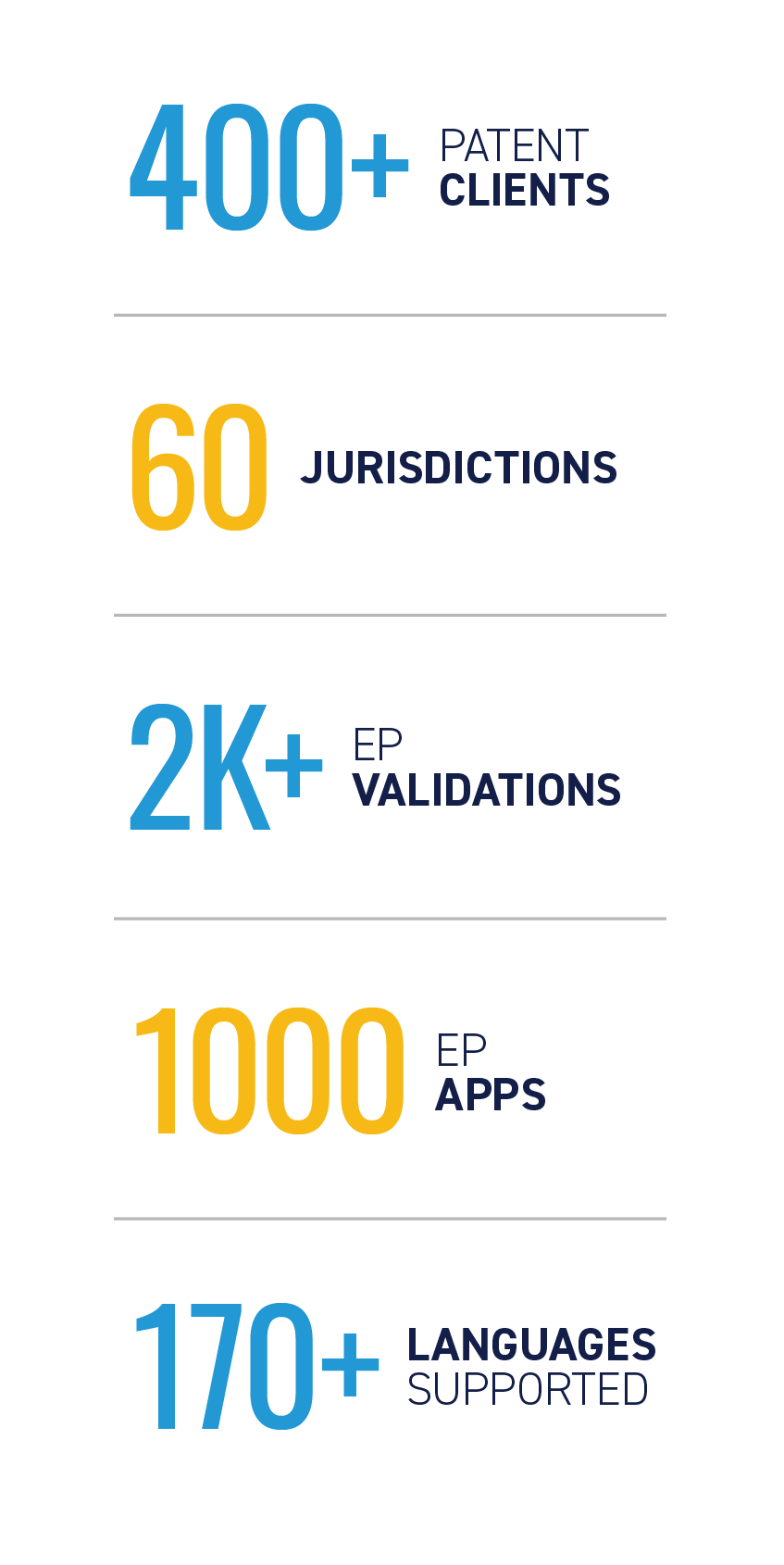 We oversee the filing process from start to finish, freeing internal patent departments from tedious processes. Our account managers are your single point of contact to provide fast and detailed responses to all inquiries. Our specialized team of patent attorneys and pool of filing agents handle a range of different patent types and formats, including intellectual property translation services.